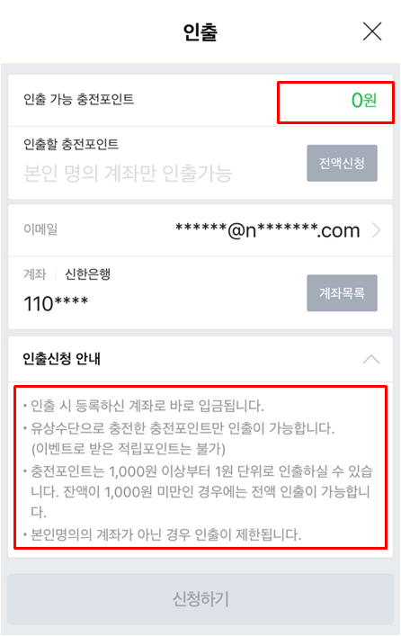 인출 가능 포인트가 있으신 분들은 인출하고 싶은 금액만큼 입력해서 신청하기 버튼을 눌러주시면 등록한 계좌로 바로 입금이 됩니다 :) 본인 명의의 계좌가 아닌 경우 인출이 제한되니 이점도 참고 부탁드릴게요!