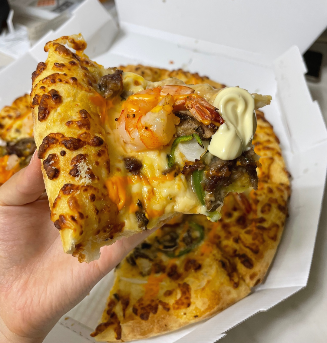 큼직한 새우 토핑과 비프, 파인애플 외 여러가지 야채 토핑과 치즈가 듬뿍 들어가 있네요