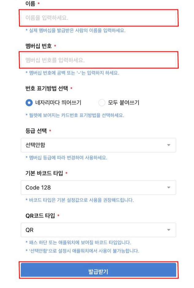 정보를 입력란에 이름, 멤버십 번호 입력하고