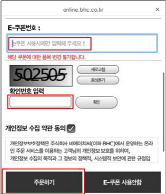 위 사진과 같이 E-쿠폰번호 입력창이 나오면 기프트콘 바코드 밑 숫자를 차례로 입력해주시고 주문하기 버튼을 눌러주세요 E-쿠폰으로 주문 시에는 품목 변경이 불가능하기 때문에 이점 참고해주세요