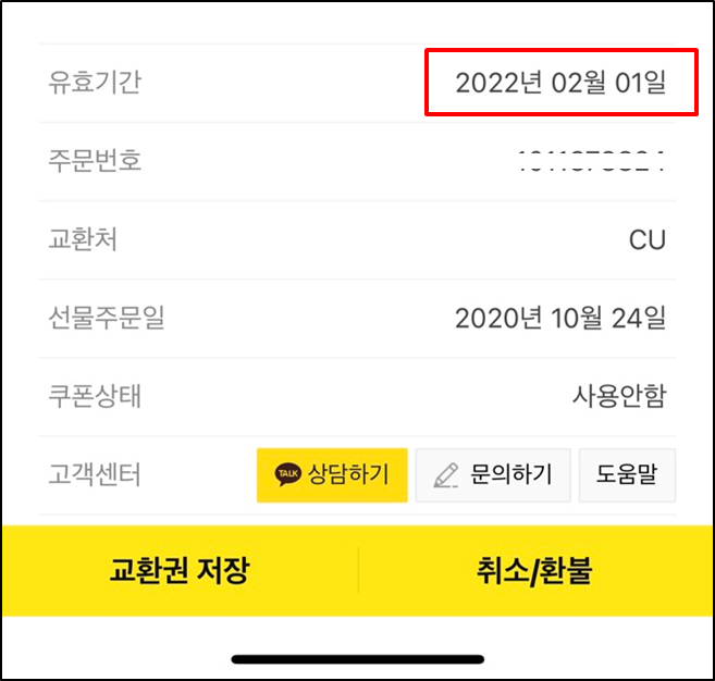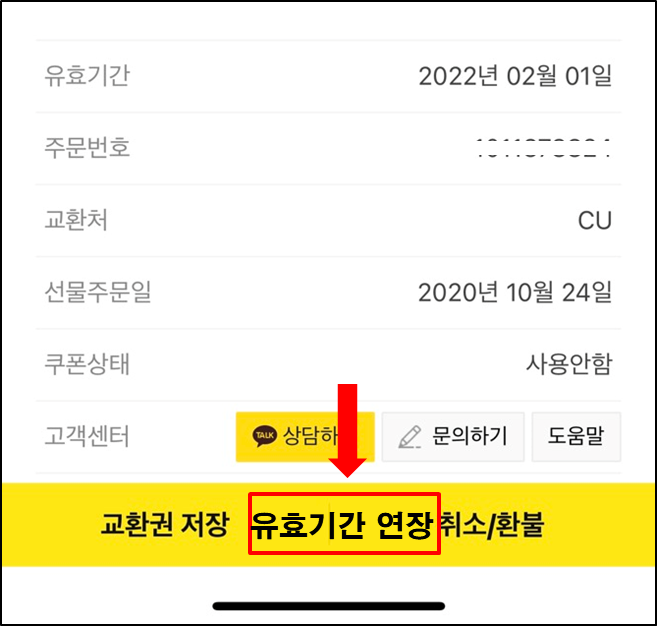 아까와 동일하게 선물하기->선물함->받은 선물-> 기프티콘 선택 순으로 들어가 보면 하단에 유효기간 연장 버튼이 있으니 기간 내에 사용을 하지 못할 경우에는 유효기간 연장을 해 사용하시면 되겠습니다