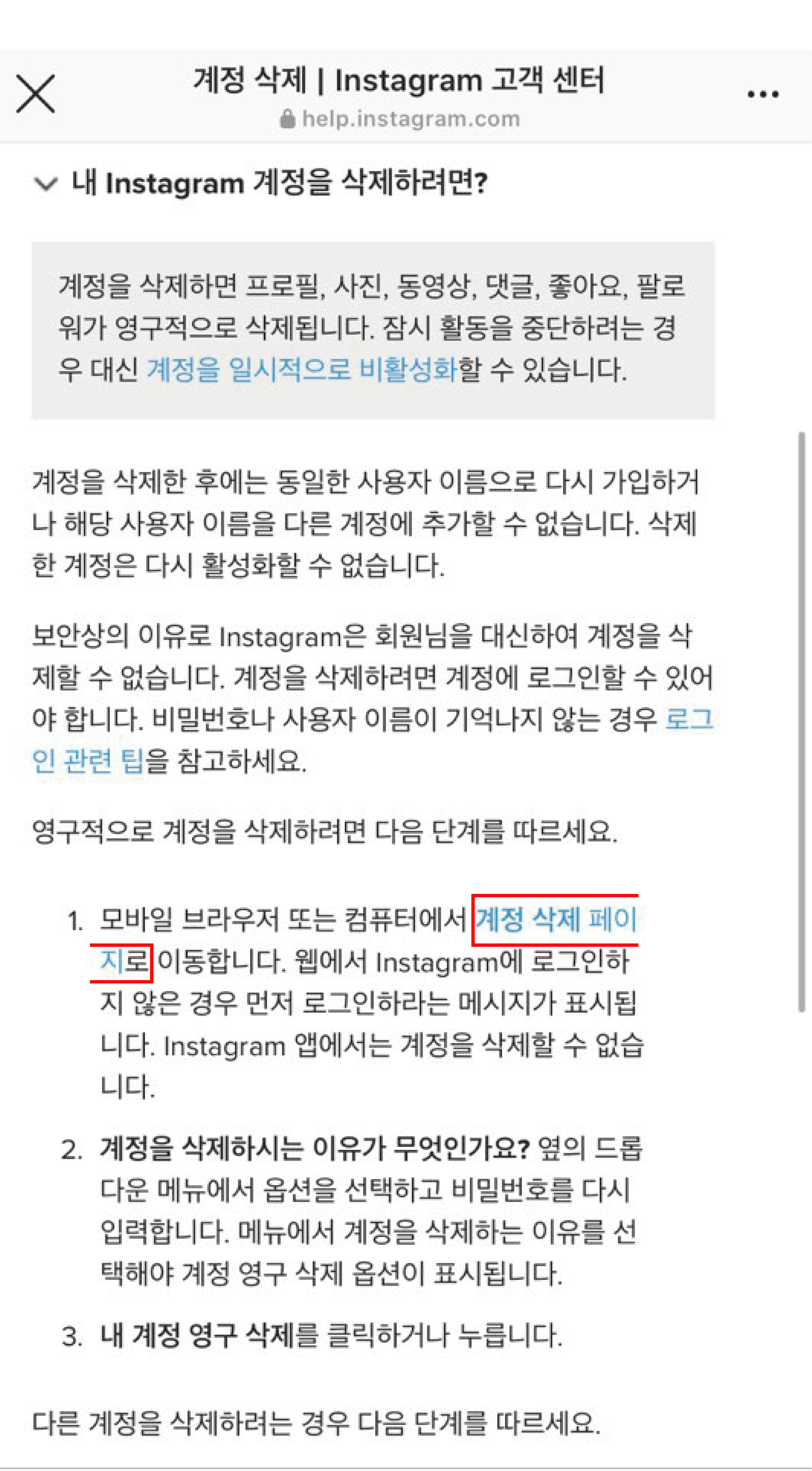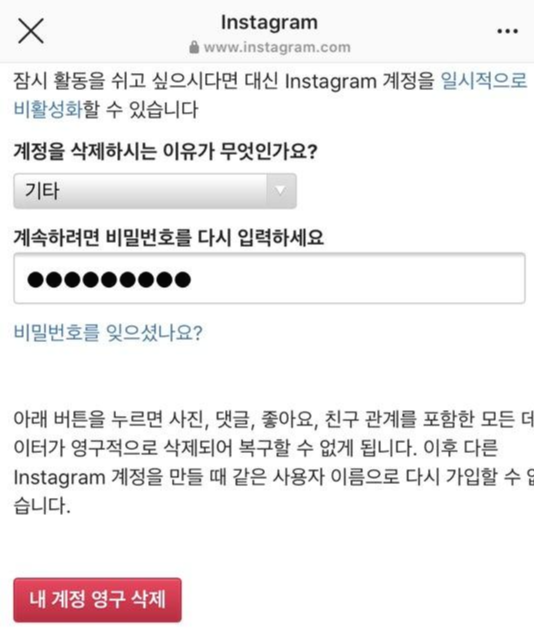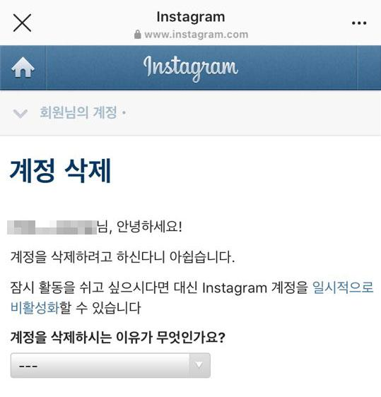 내인 스타 그램 계정을 삭제하려면? 을 클릭해주면