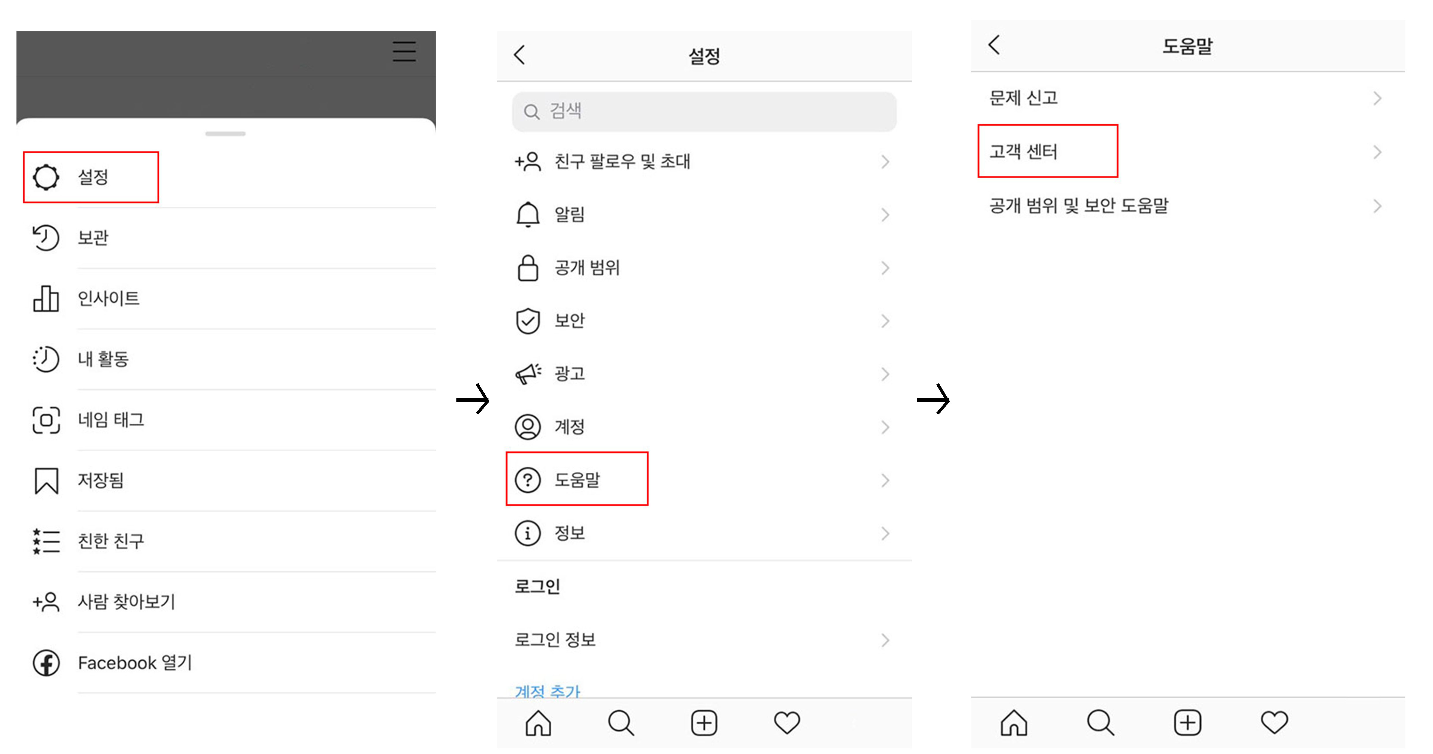 설정 -> 도움말 -> 고객센터 순으로 이동해줍니다!