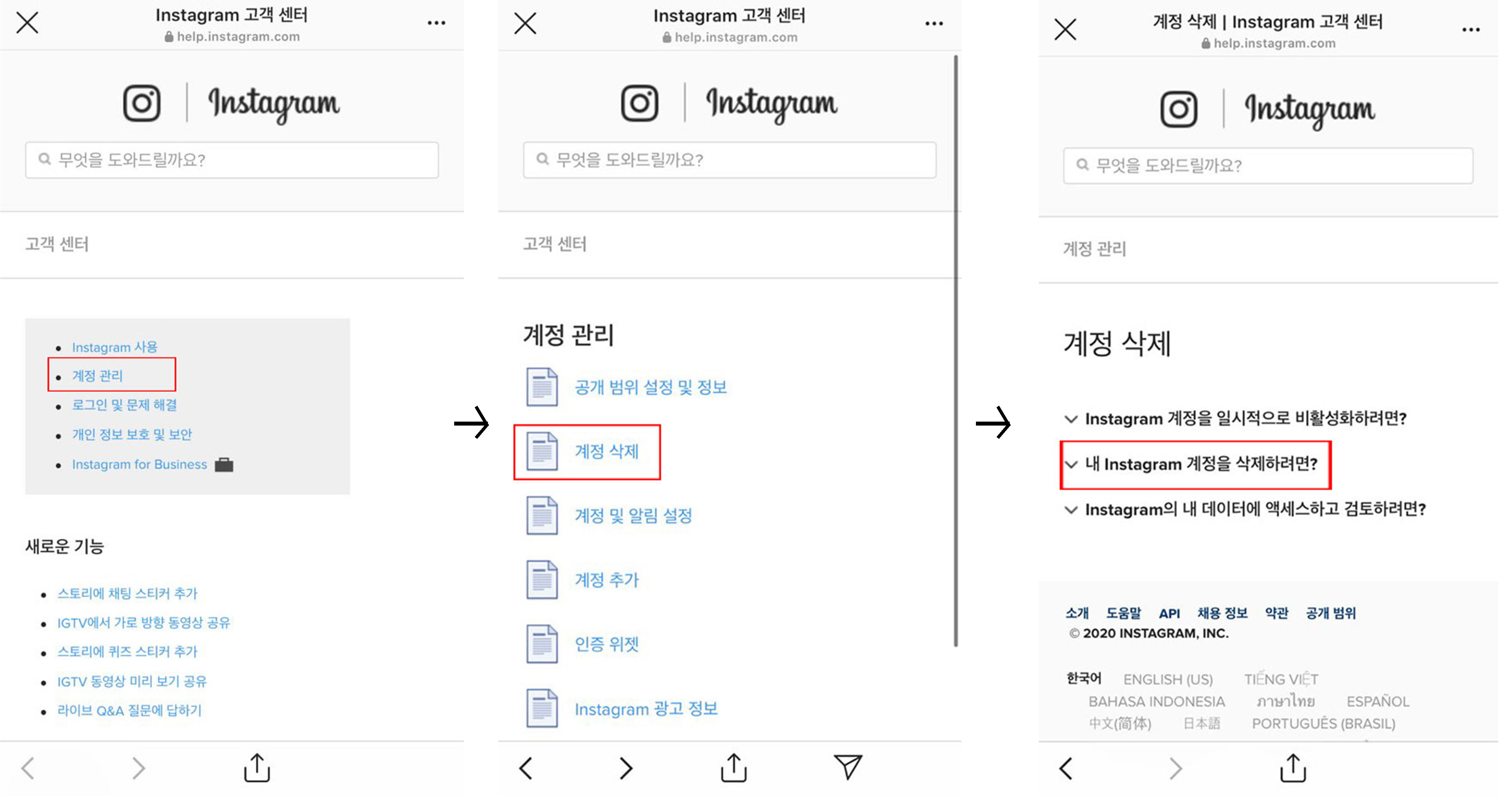 그다음 계정관리 -> 계정 삭제 -> 내 인스타그램 계정을 삭제하려면? 클릭!