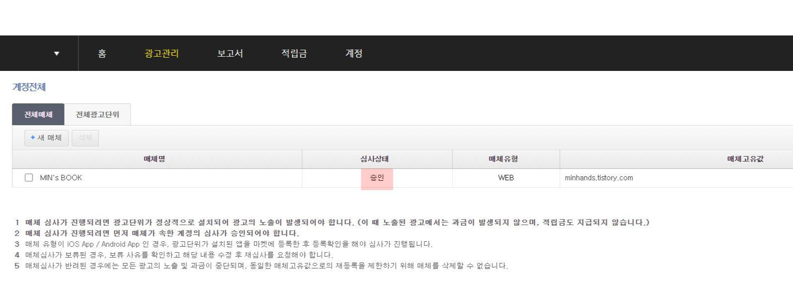 카카오애드 핏에 들어가 보니 심사 상태가 승인! 으로 바뀐 걸 확인할 수 있었습니다 킄ㅋㅋ