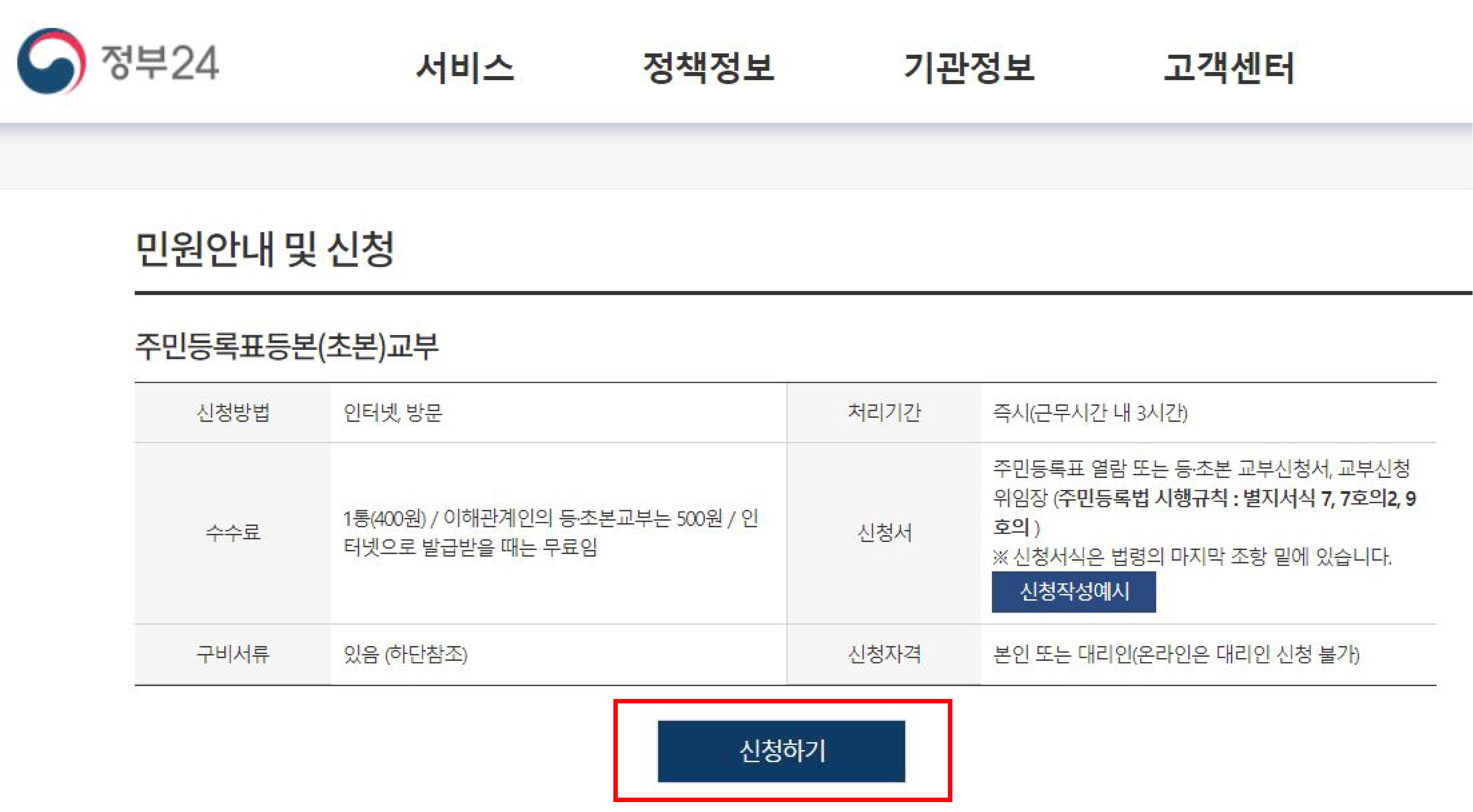 대신, 온라인은 대리인이 신청 불가하고 본인만 가능하는 점 참고해주시고 신청하기 버튼 클릭해줍니다.