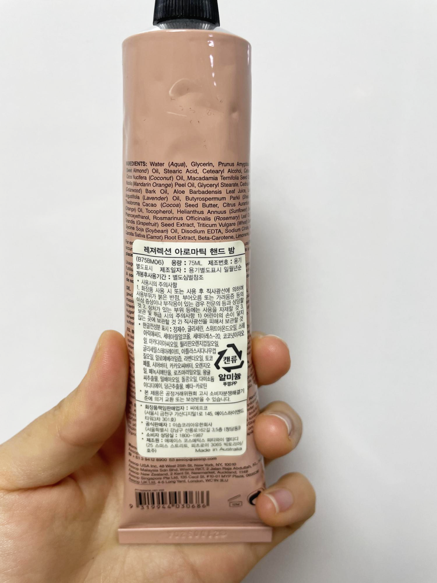 핸드크림의 정확한 제품명은 레저렉션 아로마틱 핸드 밤 75ml 입니다.