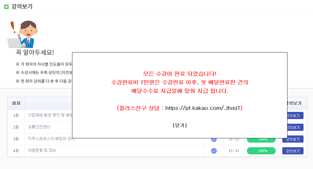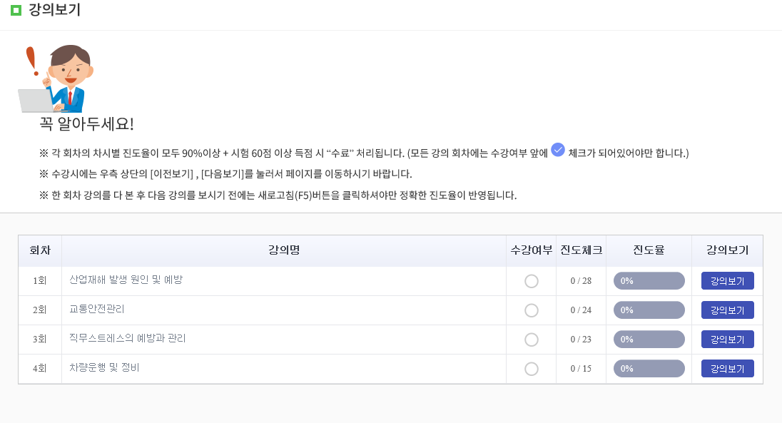 가입절차를 끝내면 반드시 안전교육 강의 수료를 해야 하는데요