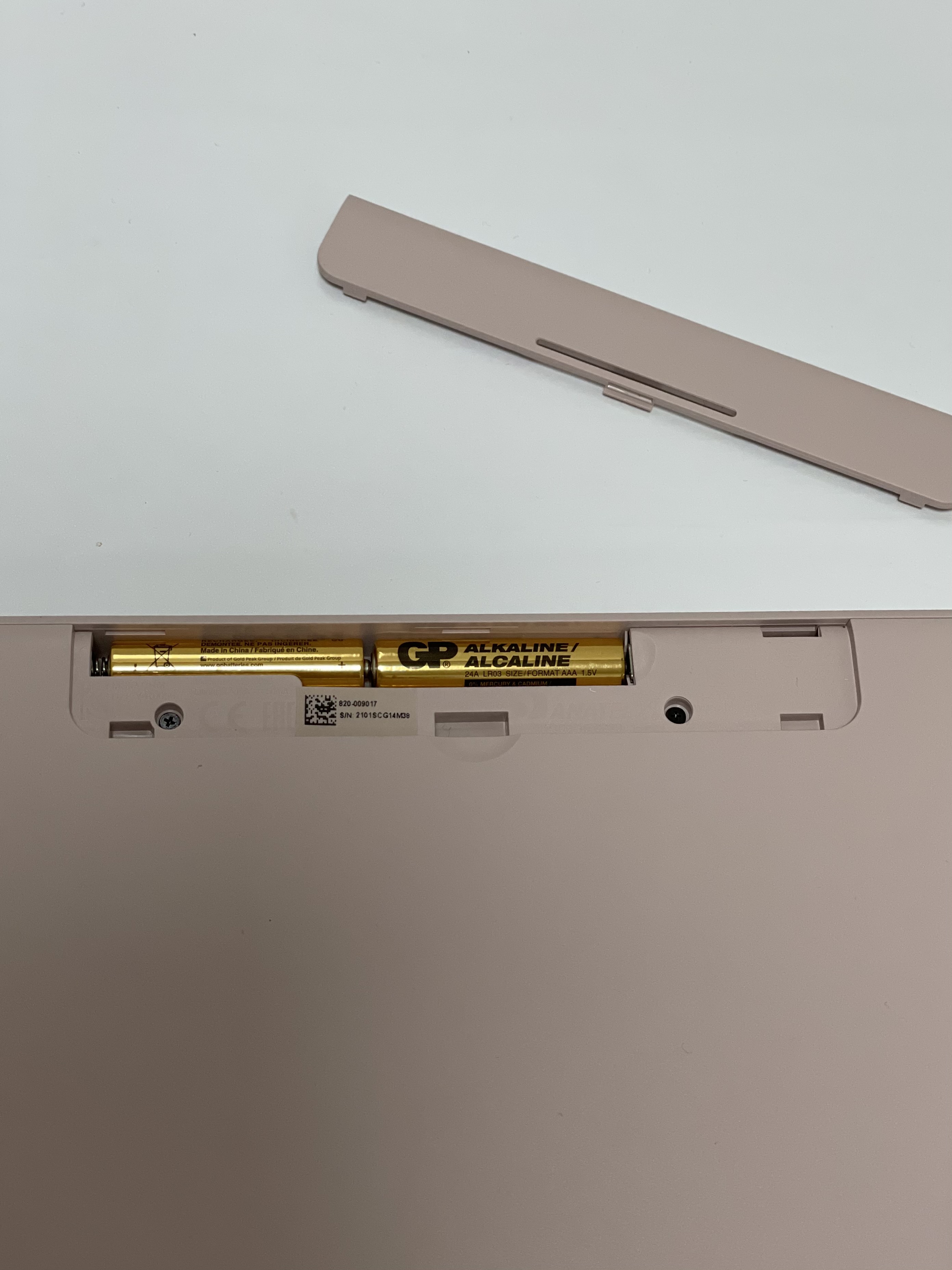 키보드 뒷면을 보면 건전지를 넣을 수 있는 부분이 있고 AAA건전지 두개가 들어가 있었어요!